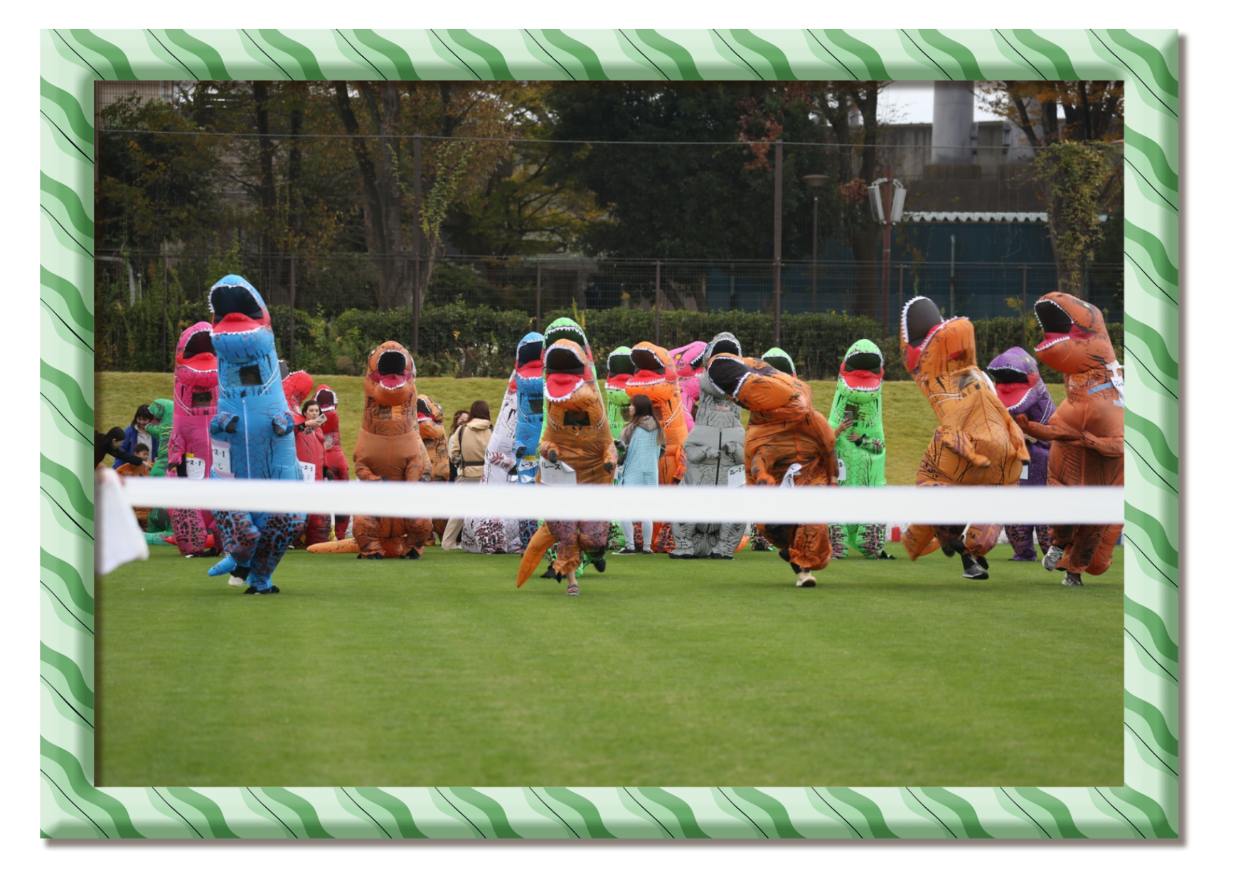 子どもから大人まで、ティラノサウルスの着ぐるみを着て全力疾走!